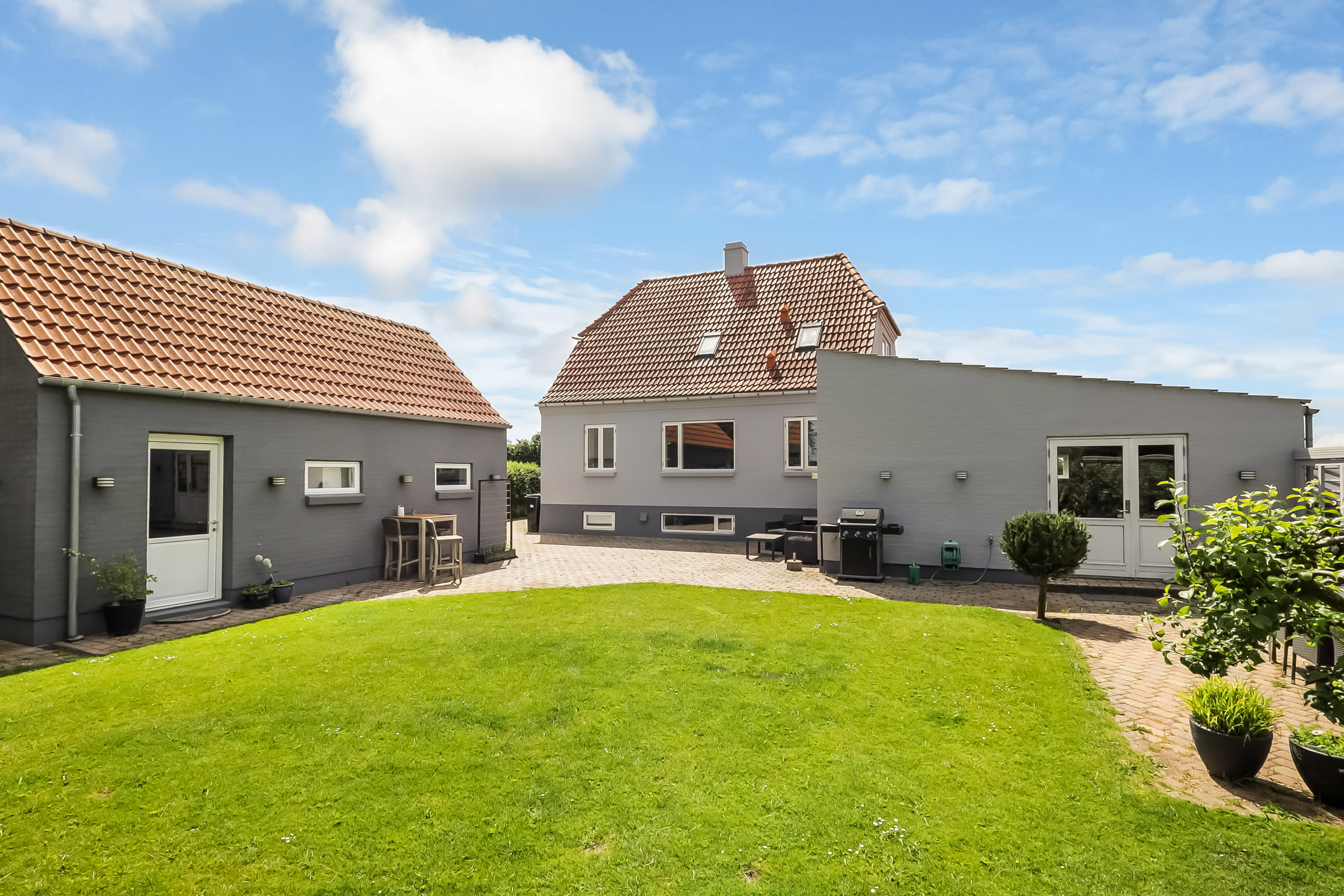 Ejendommen er omgivet af en flot og velplejet have, hvor der er tænkt på både nydelse og funktion. Her finder du flere lækroge, en solrig terrasse til de varme dage, og et bålsted der indbyder til hygge, snobrød og stjernekig.