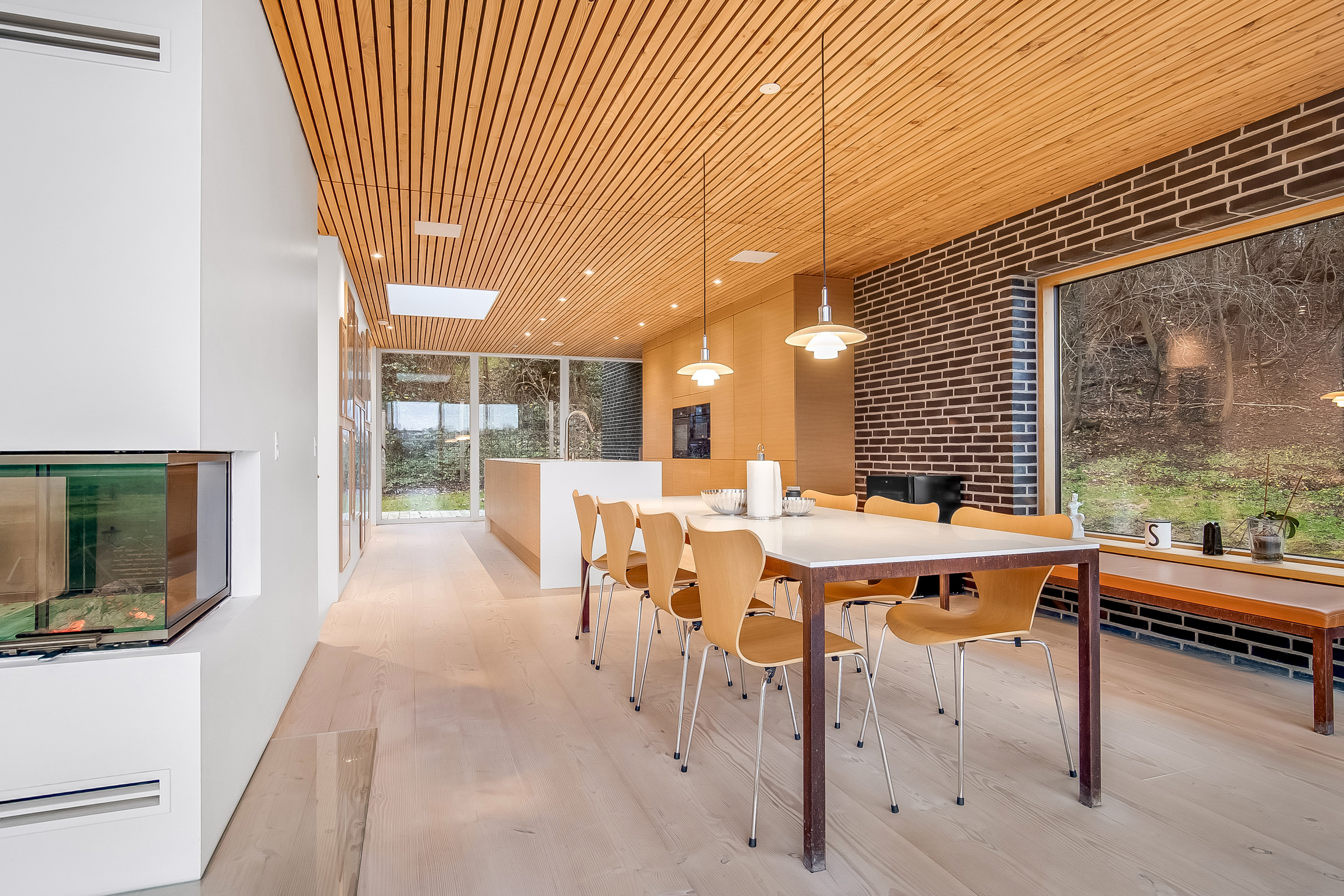 Boligen er tegnet med en klar arkitektonisk vision, hvor rene linjer, generøse lysindfald og åbne opholdsrum skaber en eksklusiv og rolig atmosfære. Hjertet i huset er det imponerende køkken/alrum, som ligger i elegant, åben forbindelse med stuen. Her smelter funktionalitet og design sammen og danner ramme om både hverdagsliv og gæstebud på højt niveau. Det gennemgående gulv i smukt douglas fyrretræ tilfører boligen varme, karakter og en tydelig fornemmelse af kvalitet.