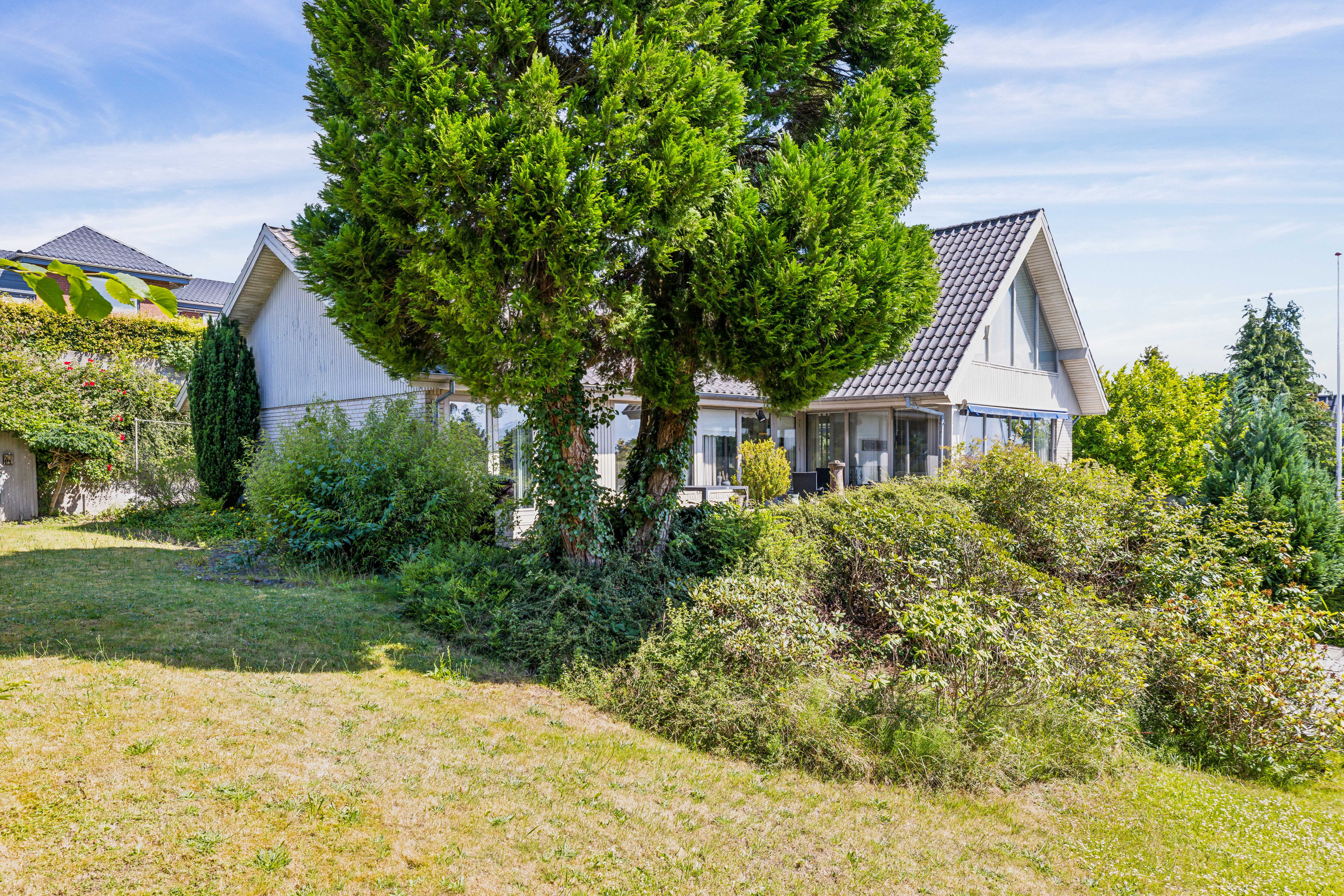 På den 1.101 kvadratmeter store grund er her både græsplæne og 2 store terrasser som er privat anlagt i læ med udsigt til Flensborg fjord.
