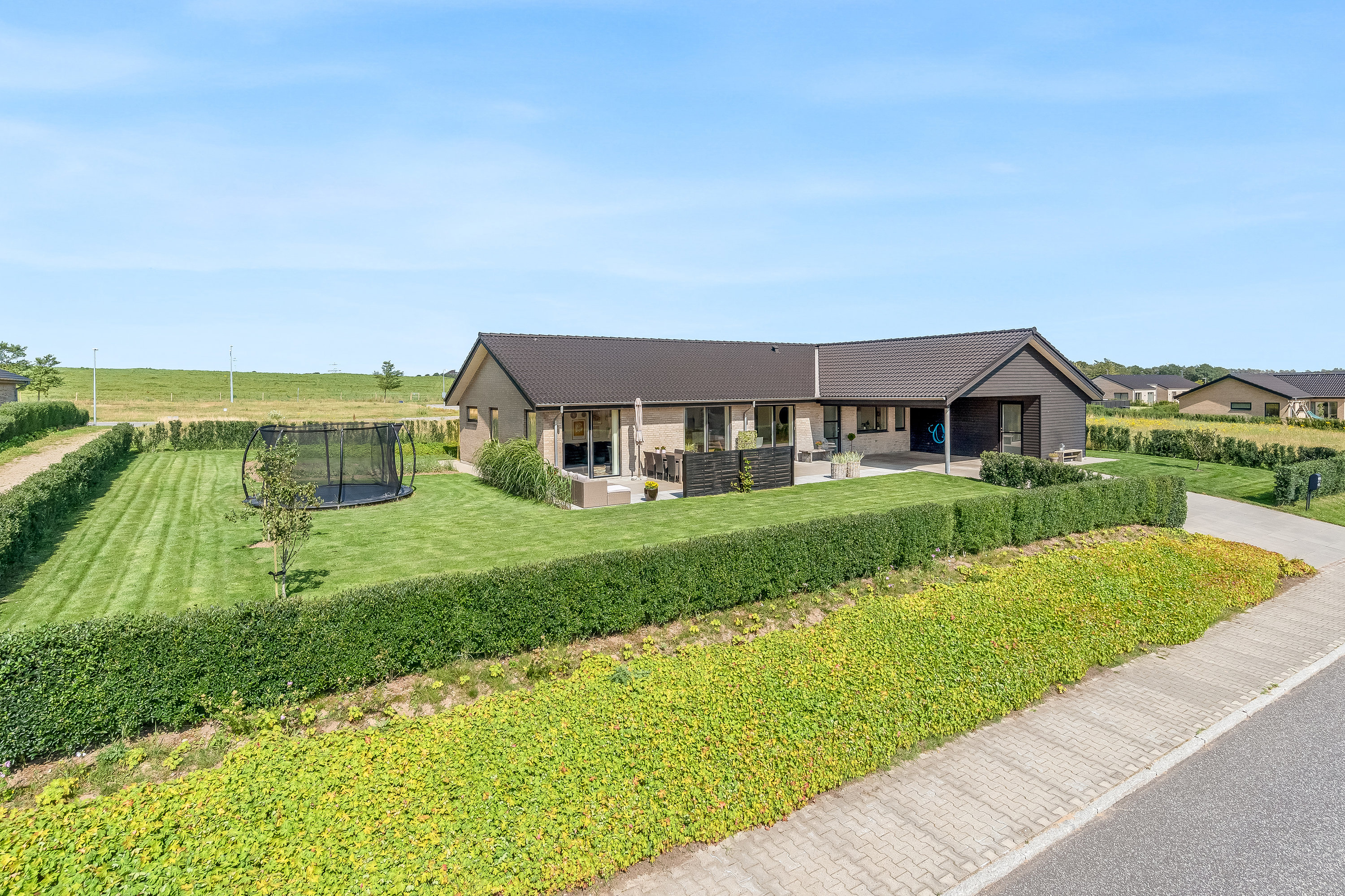 Flisebelagt indkørsel til en god dobbelt carport med redskabsrum. Fra carporten er der direkte adgang til entréen.
