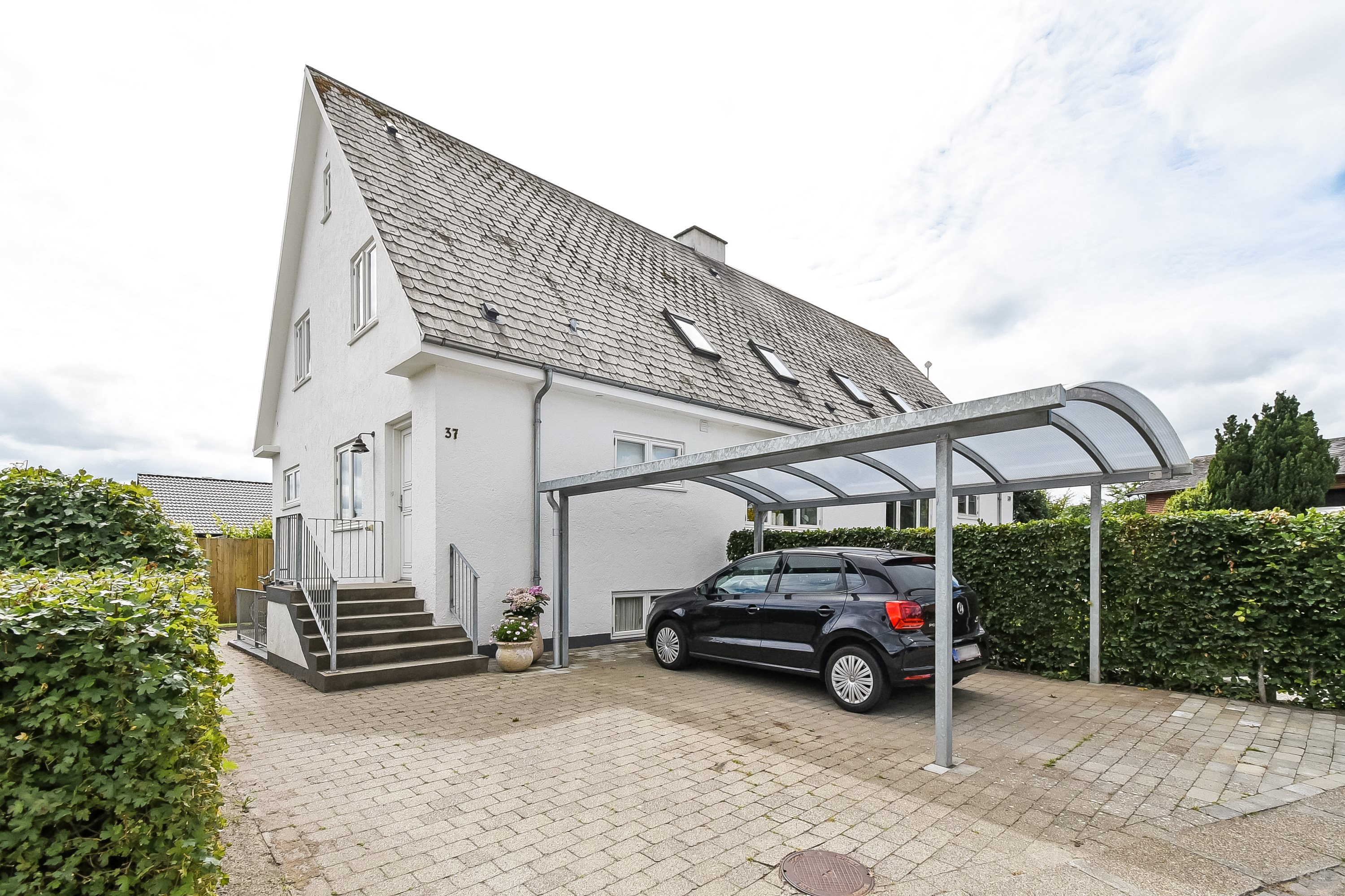 Boligen er den ene del af et velholdt og velbygget dobbelthus opført i 1954. Fremstår med pudsede facader som er hvidmalede i 2016, eternittag og udskiftede hvide træ-/aluvinduer i 2008. Galvaniserede tagrender og gelænder til udendørs trapper. Desuden en fritstående galvaniseret carport opført i 2017 på i alt 22 m2.