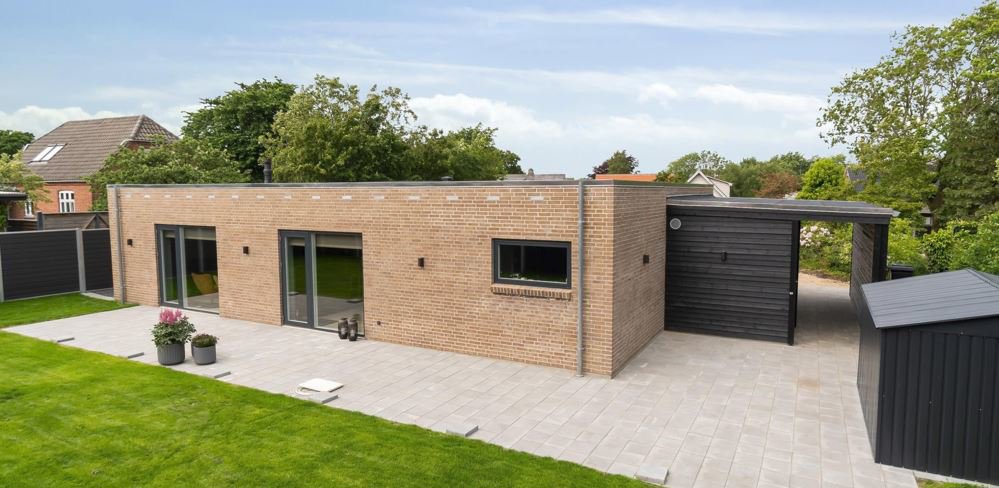 Carport, der er fint placeret ved bryggersindgangen, har tilhørende redskabsrum.