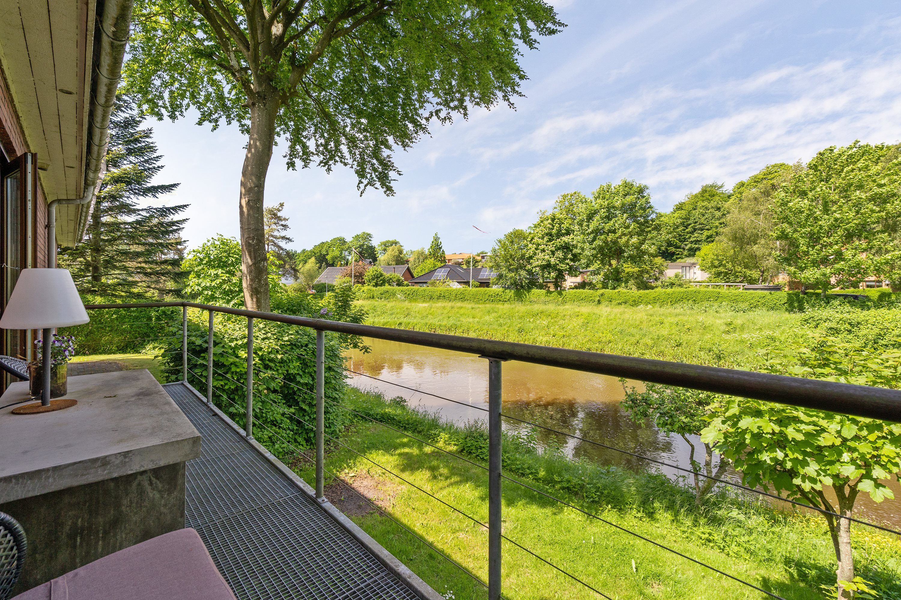 Skøn have med stor terrasse ved huset og flere hyggekroge rundt omkring, bl.a. med skøn udsigt til Storåen.