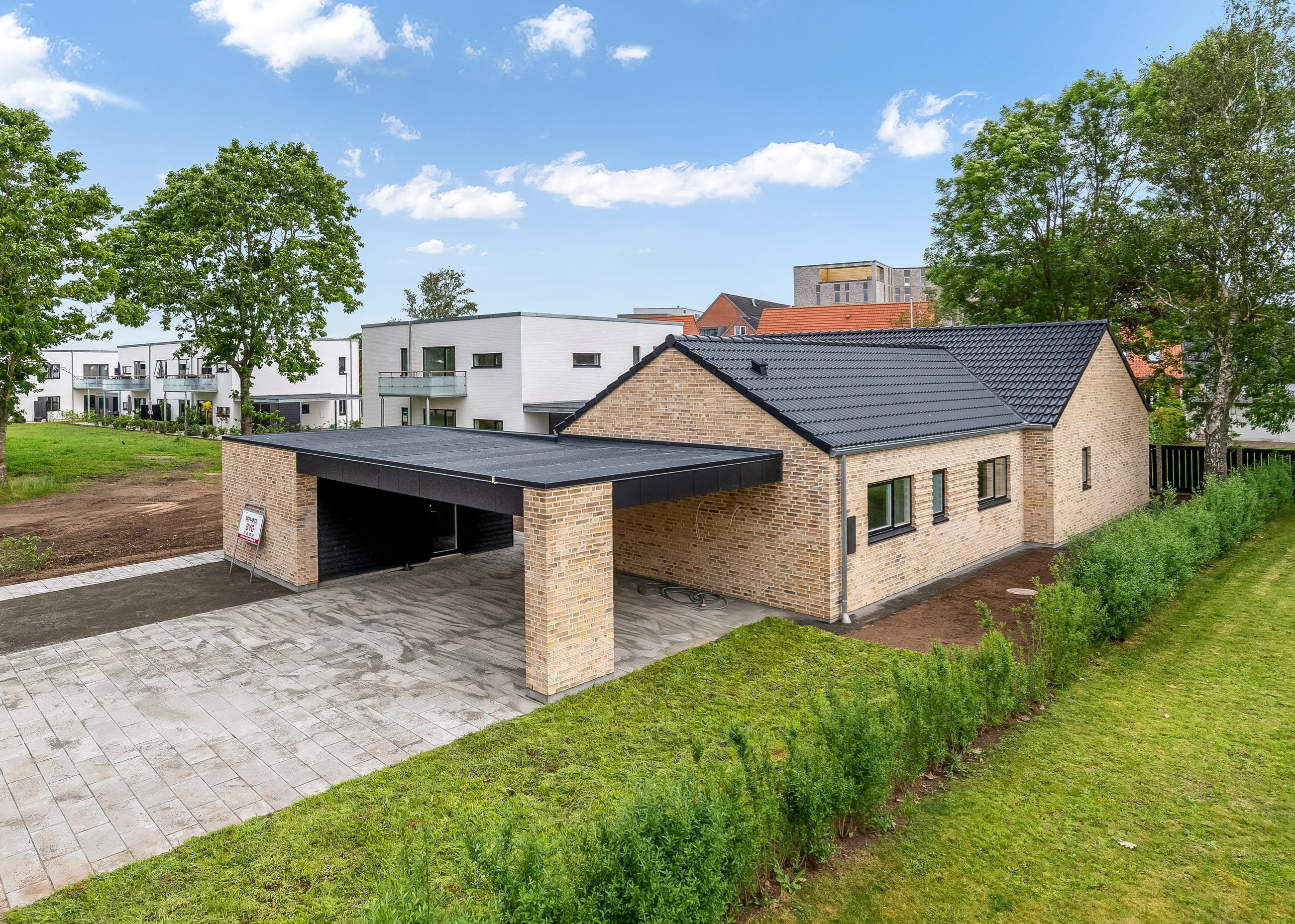 Carport og skur udføres i sortmalet træbeklædning og i indkørsel og gårdrum lægges 30x60 cm fliser.