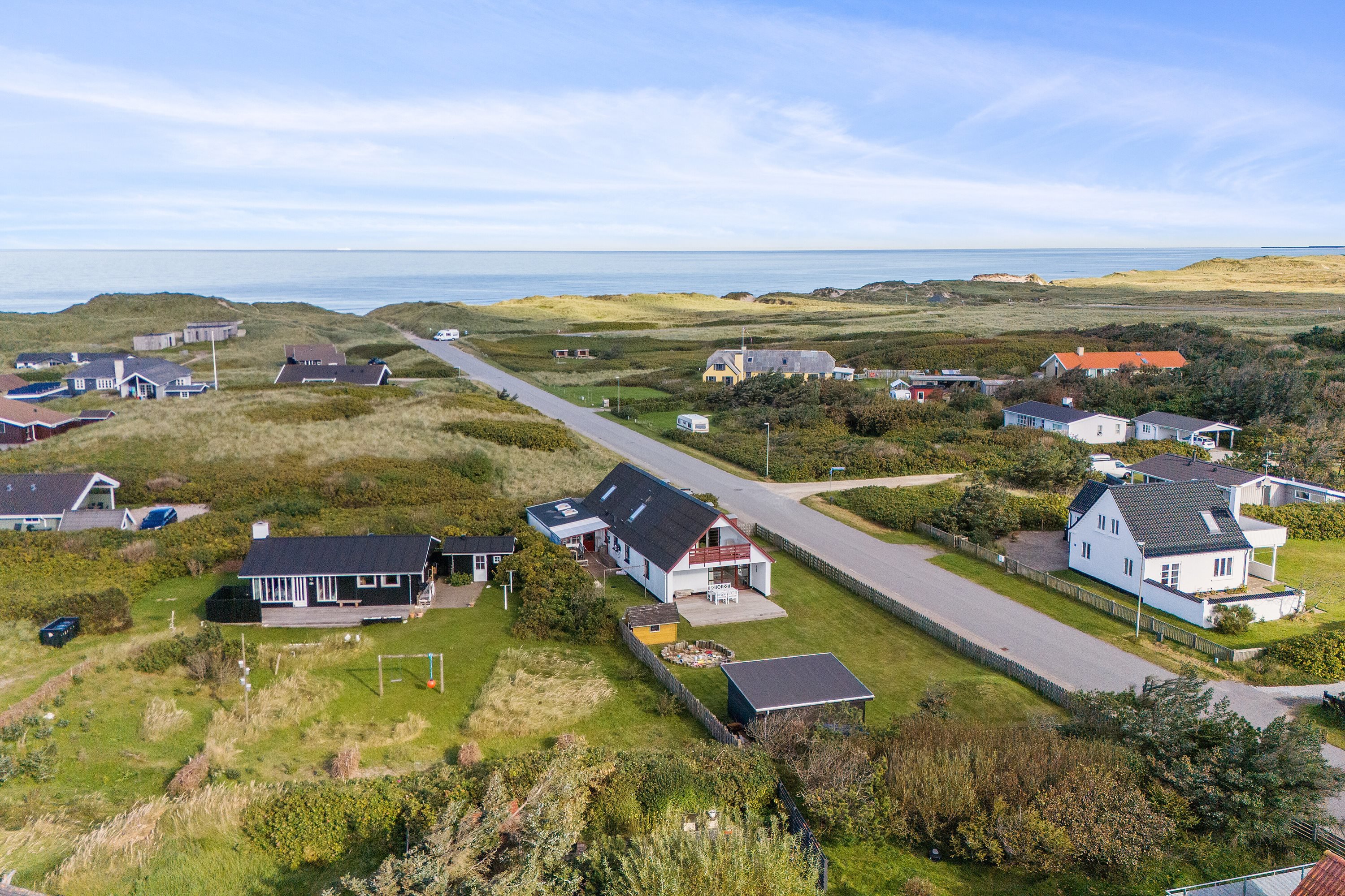 Udenfor får du en dejlig, familievenlig have med både legehus og sandkasse. Derudover er der et stort udhus med masser af plads til opbevaring – fx surfudstyr, cykler eller haveredskaber. Og når du får lyst til en frisk tur i naturen, er der kun ca. 300 meter til stranden, hvor du kan gå i klitterne, dyppe tæerne i vandet eller nyde solnedgangen over havet.