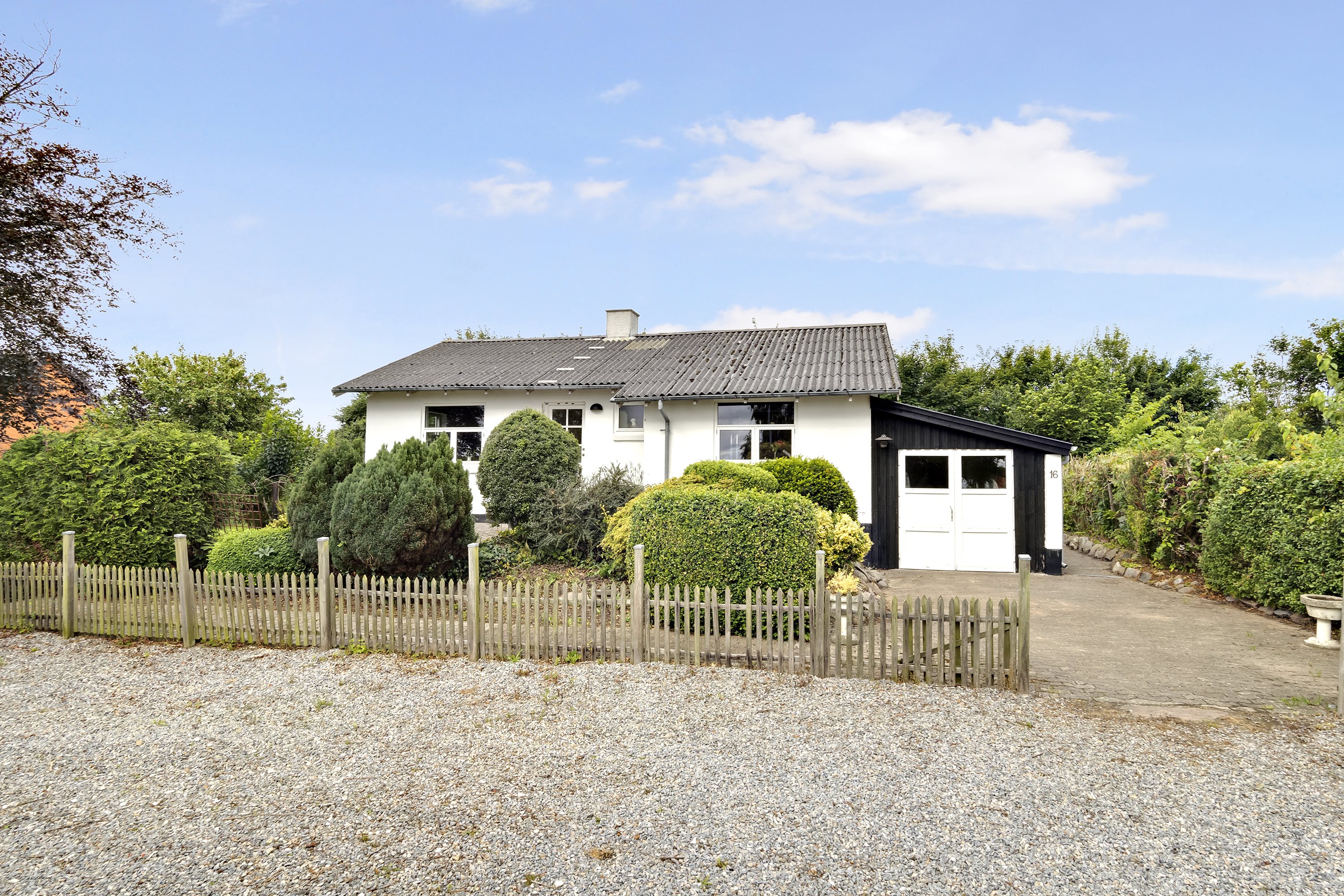 Villaen er beliggende på 1.360 m2 grund med grusbelagt indkørsel og dejlig, lukket have med flere ugenerede terrassepartier.