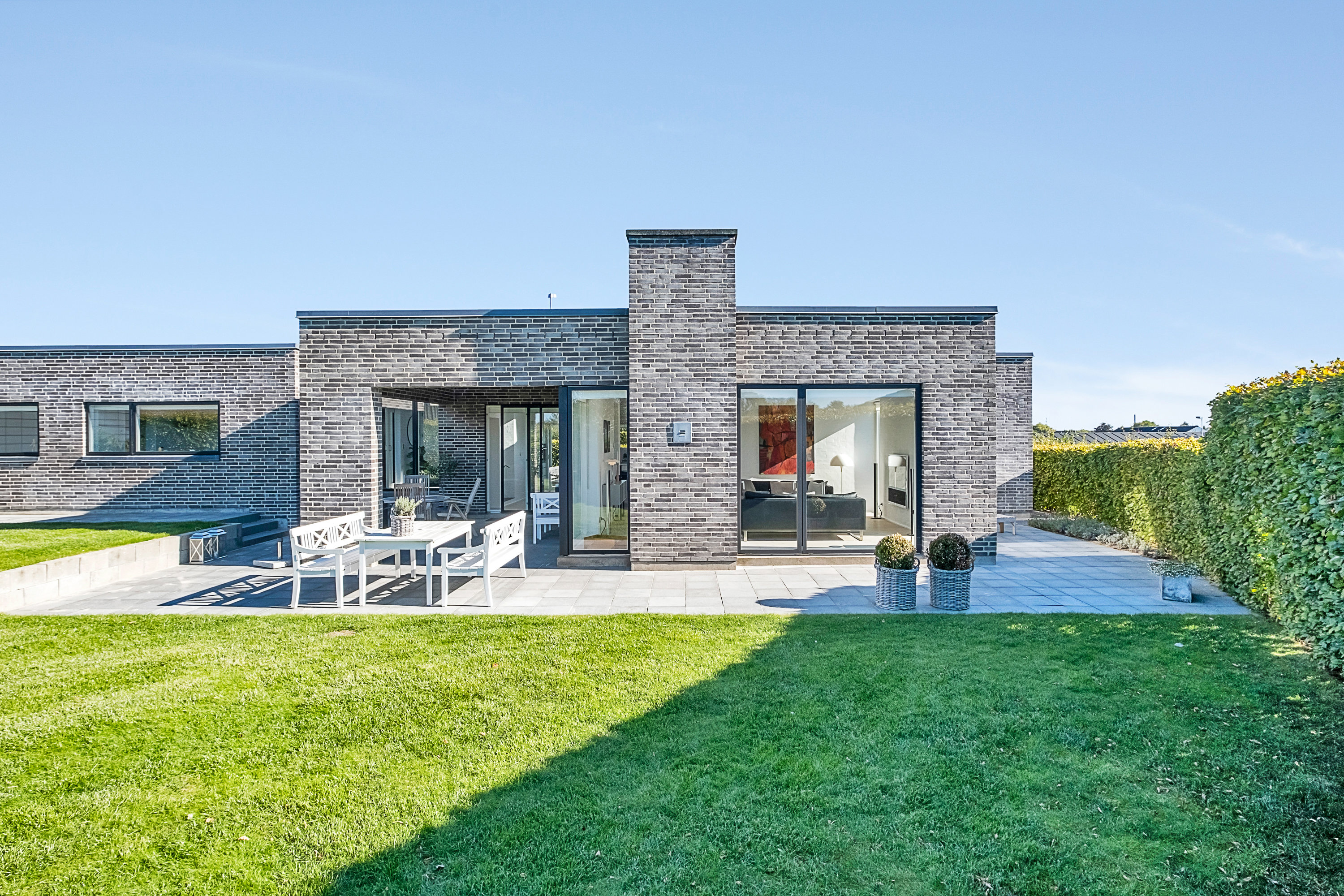 Store vinduespartier sikrer et skønt lysindfald hele dagen og en naturlig overgang til haven. Der er indbygget lydanlæg i både forældre-badeværelset, alrummet og på terrassen, som giver mulighed for musik og underholdning både inde og ude.