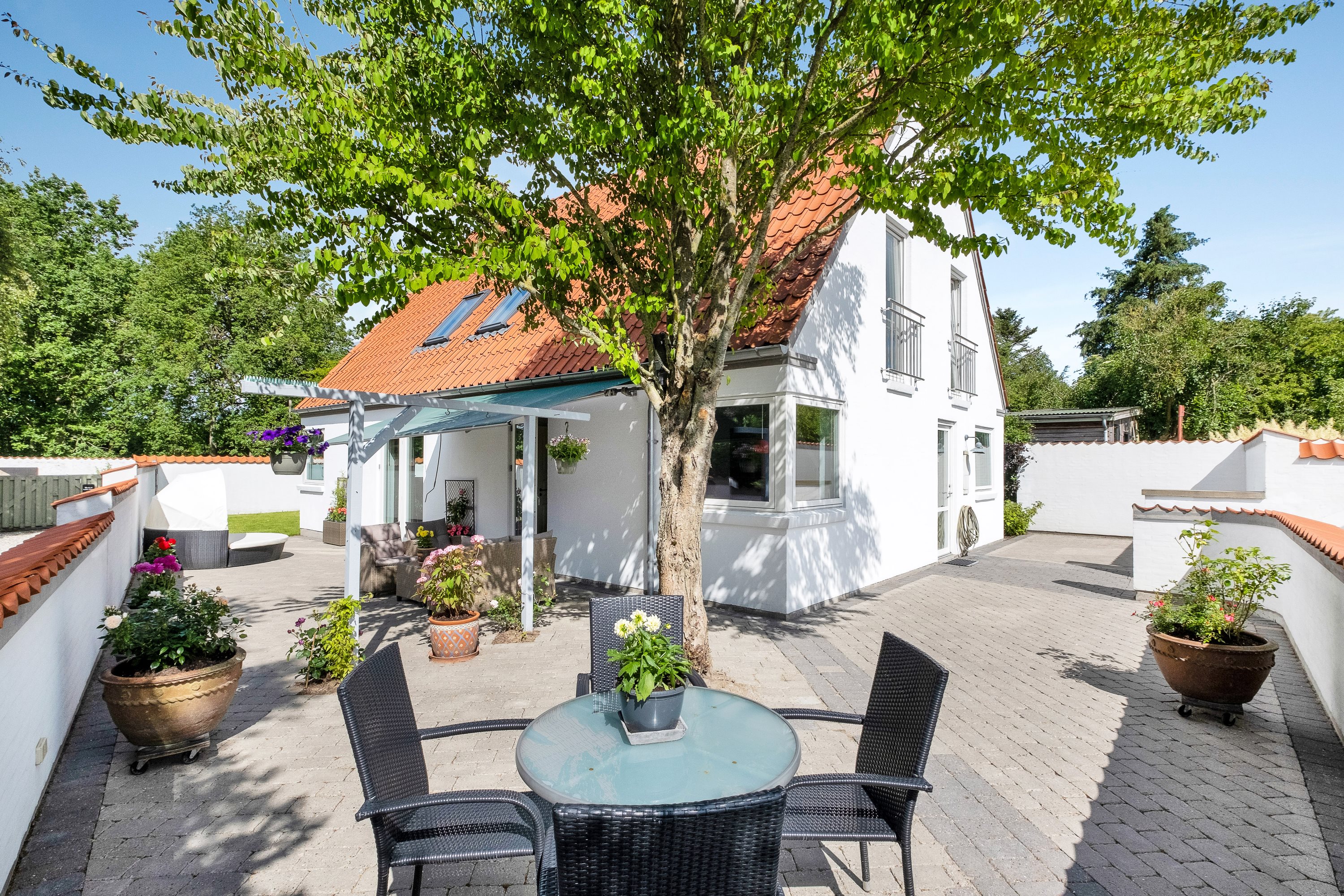 Ude er haven omkranset af murværk, der skærmer for indkig - og dermed sikrer jer en ganske privat og ugeneret have. Her kan I se frem til at nyde sommeren under markisen på det sydøstvendte terrassemiljø eller på plænen mod vest - hvor end I vender jer, er haven solrig og dejlig fredelig. Til ejendommen hører ligeledes 46 kvm garage med fjernbetjent el-port, ligesom der er installeret 380 volt herinde, hvor opbevaringspladsen er god og mulighederne for håndværkeren mange.