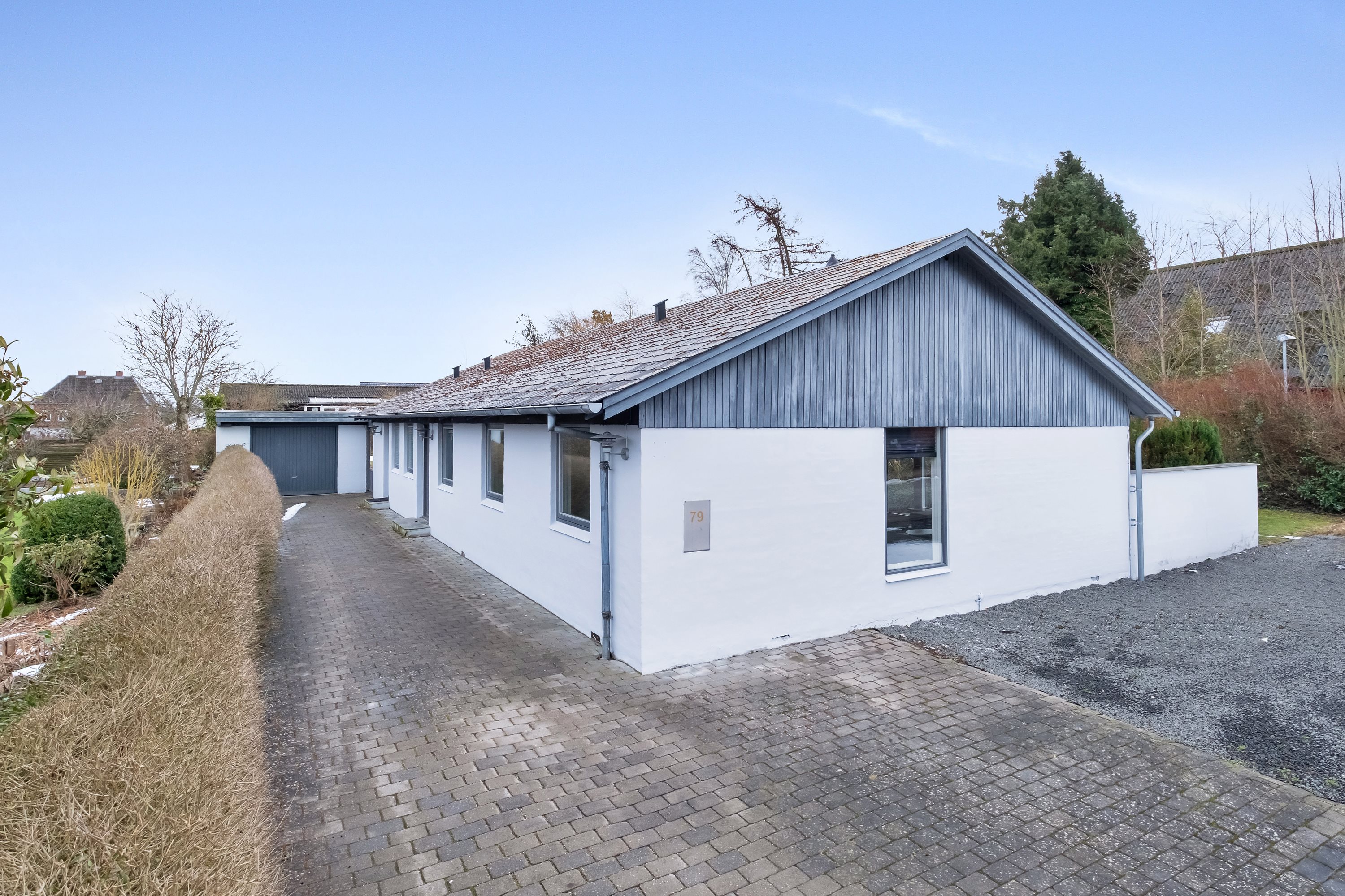 På Manbjergvej 79 i Løgten finder I denne etplansvilla fra 1972, der består af 145 kvm. Planløsningen er ganske velfordelt og byder på fire soveværelser, et badeværelse, et toilet, et bryggers, et køkken-alrum og en stue. Hertil har I en dejlig grund på 878 kvm, som er anlagt i en pæn, nem stil, og for enden af den rummelige indkørsel er der en muret garage.