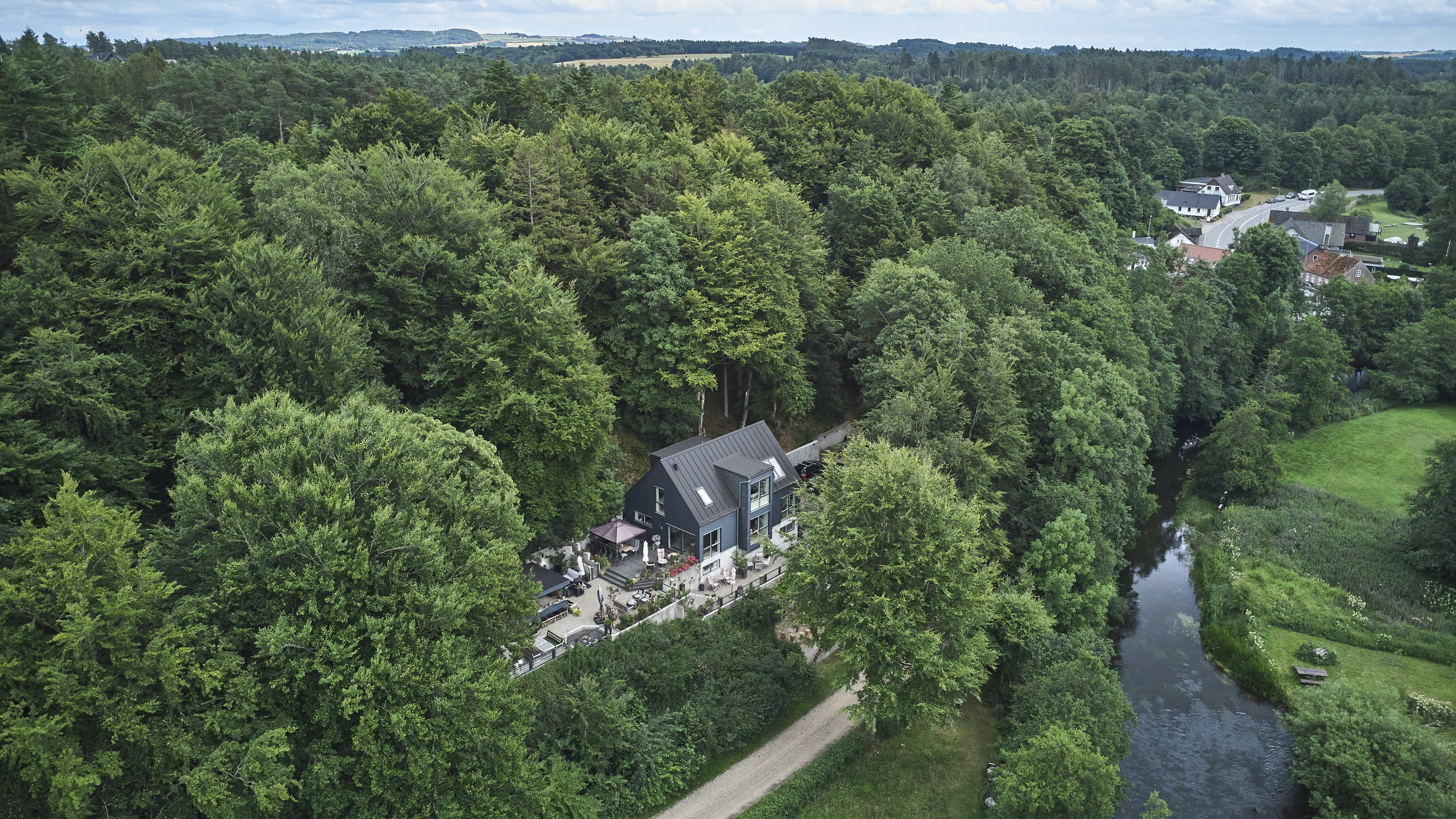Ejendommen ligger midt på en ca. 20 meter høj skråning, og herfra breder udsigten sig uhindret ud over det fredede landskab, Gudenåens slyngninger, enge og skov. Allerede ved ankomst mærker man roen og den særlige atmosfære, som stedet emmer af. Det er naturens rum, men dit hjem.