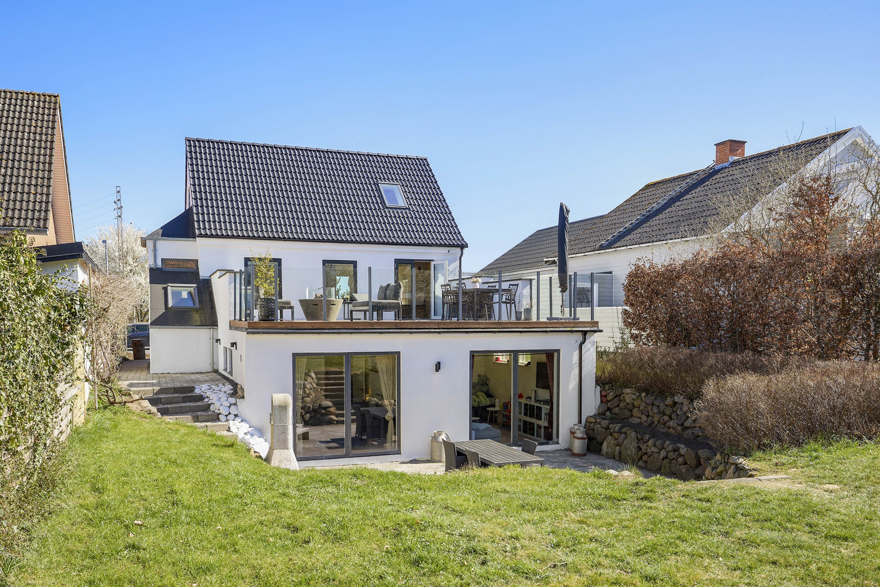 I stueplan mødes du af et imponerende køkken-alrum med plads til både hverdag og fest. Her er loftshøjden i top, lyset strømmer ind, og det elegante snedkerkøkken skaber den perfekte ramme om familiens samlingspunkt. Fra alrummet er der direkte udgang til en stor, vestvendt træterrasse, hvor du kan nyde aftensolen og udsigten over den opvoksede og ugenerede have – en lille grøn oase midt i byen. På førstesalen venter et stort, indbydende soveværelse og et luksuriøst badeværelse med separat brus og gennemgående ovenlys, som giver rummet en helt særlig stemning af ro og velvære.