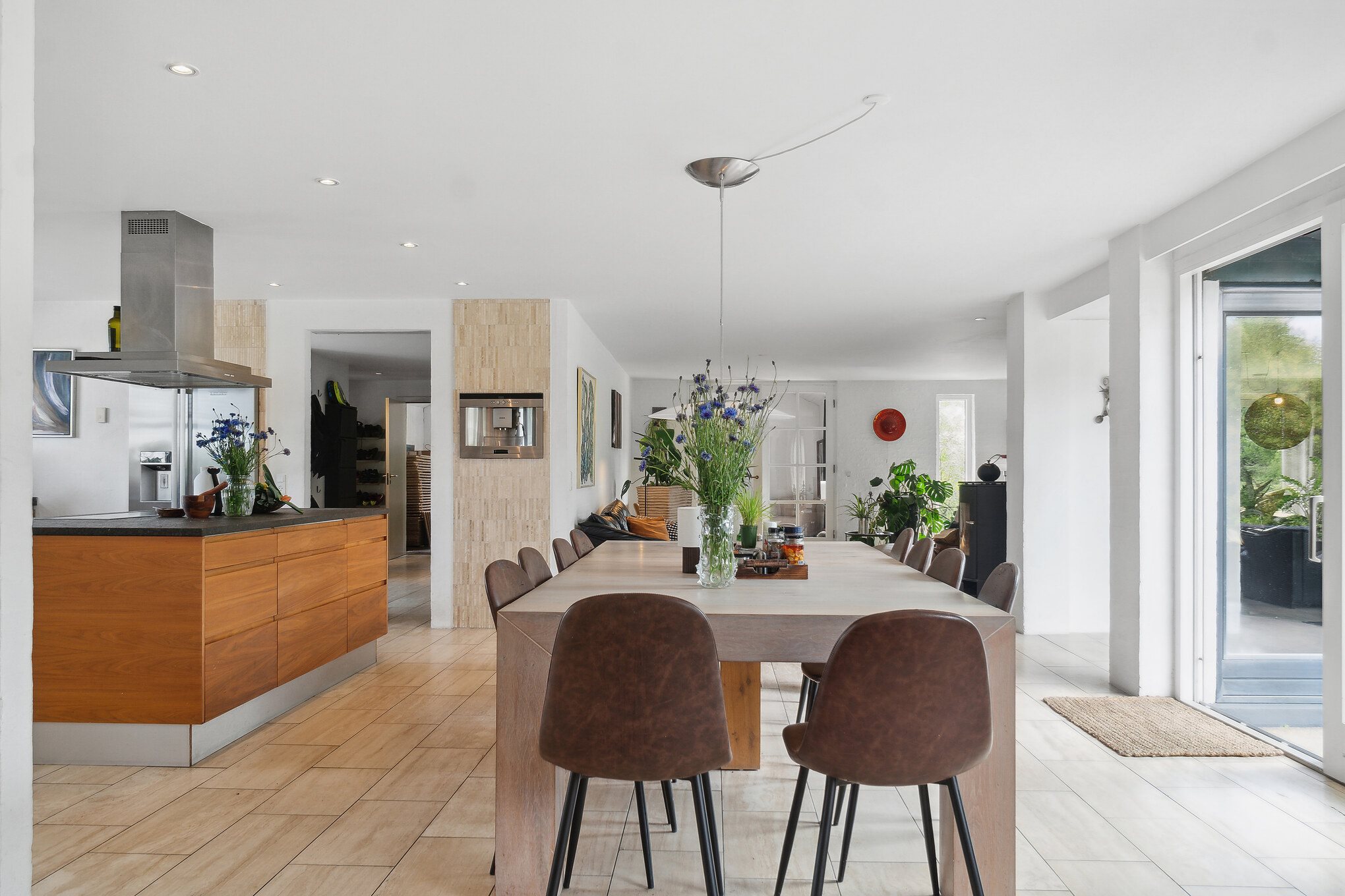 Villaen er optimalt disponeret i kraft af samlende opholdsrum og separate soveafdelinger, og i 2006 er der udført en større istandsættelse af boligen. Således finder man centralt det store køkken-alrum med åben forbindelse til en stue, som videre har adgang til yderligere to lokaler, hvoraf det ene for nærværende er benyttet som henholdsvis tv stue og kontor. Køkkenet er nydeligt og gennemført i varme toner med bordplader i børstet granit, og gulvets stilrene travertinfliser er gennemgående i den tilstødende stue. Generelt har man prioriteret lækre materialer. Alle afsnit har flere terrassedøre, hvormed ude og inde ligeledes hænger harmonisk sammen med de mange terrasser og parklignende have.