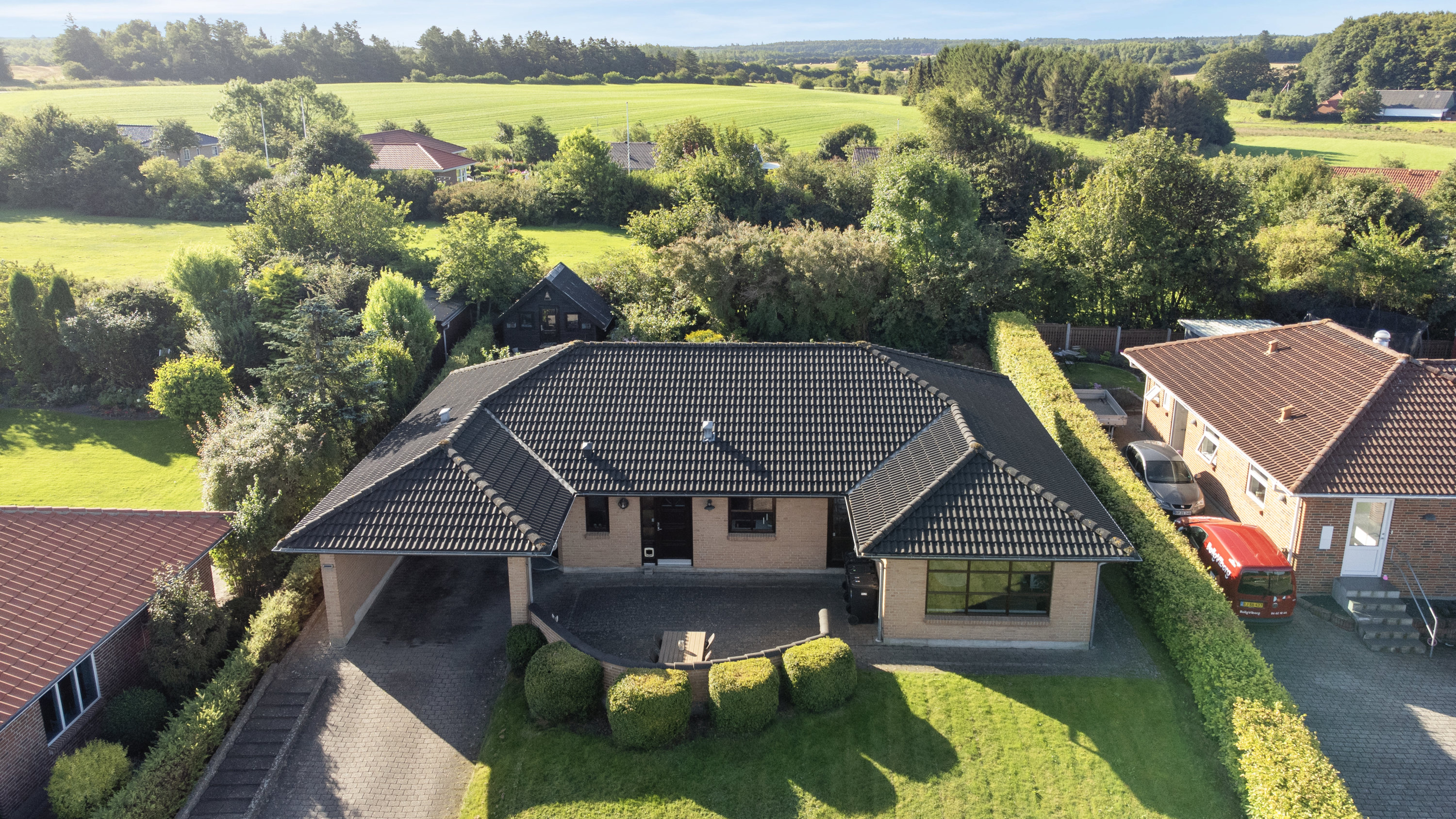 både at være sammen og gå for sig selv. Indretningen byder på entré og gang samt en anden entré, som ligeledes vil kunne indrettes til et selvstændigt og praktisk hjemmekontor/lektielæsningsplads. Dernæst en voksenafdeling med badeværelse, soveværelse plus yderligere et værelse eller kontor. I midten af boligen er så det skønne køkken/alrum i delvis åben forbindelse med en dejlig stue, og endelig en børne-/ungeafdeling med hele tre værelser samt hjemmets andet badeværelse. Her er altså i alt fem værelser, hvilket gør villaen velegnet til den store familie. En integreret carport giver jer direkte og tørskoet adgang til huset, mens flere store terrasser på begge sider af huset sørger for, at I altid har mulighed for at finde sol eller skygge, alt efter temperatur og ønske. Haven er ret nem at holde, især hvis I anskaffer en robotklipper. Den tid, I sparer på havearbejdet, kan I så i stedet bruge på at nyde den skønne udsigt, som er resultatet af boligens høje beliggenhed i landskabet. En anden ting, som er værd at fremhæve, er det grønne fællesareal, I kommer til at bo op til. Her er der alle muligheder for familiens børn til at løbe krudtet af sig, med boldspil og leg sammen med kvarterets andre børn. Nu vi er ved det med beliggenheden; I kommer her til at bo i Ulbjerg, som er et særdeles aktivt og velfungerende lokalsamfund med et helt fantastisk foreningsliv. Derudover er her både daginstitution, skole og købmand, og endelig kan I glæde jer over nærheden til områdets større byer som Aalestrup, Skive, Viborg m.fl.