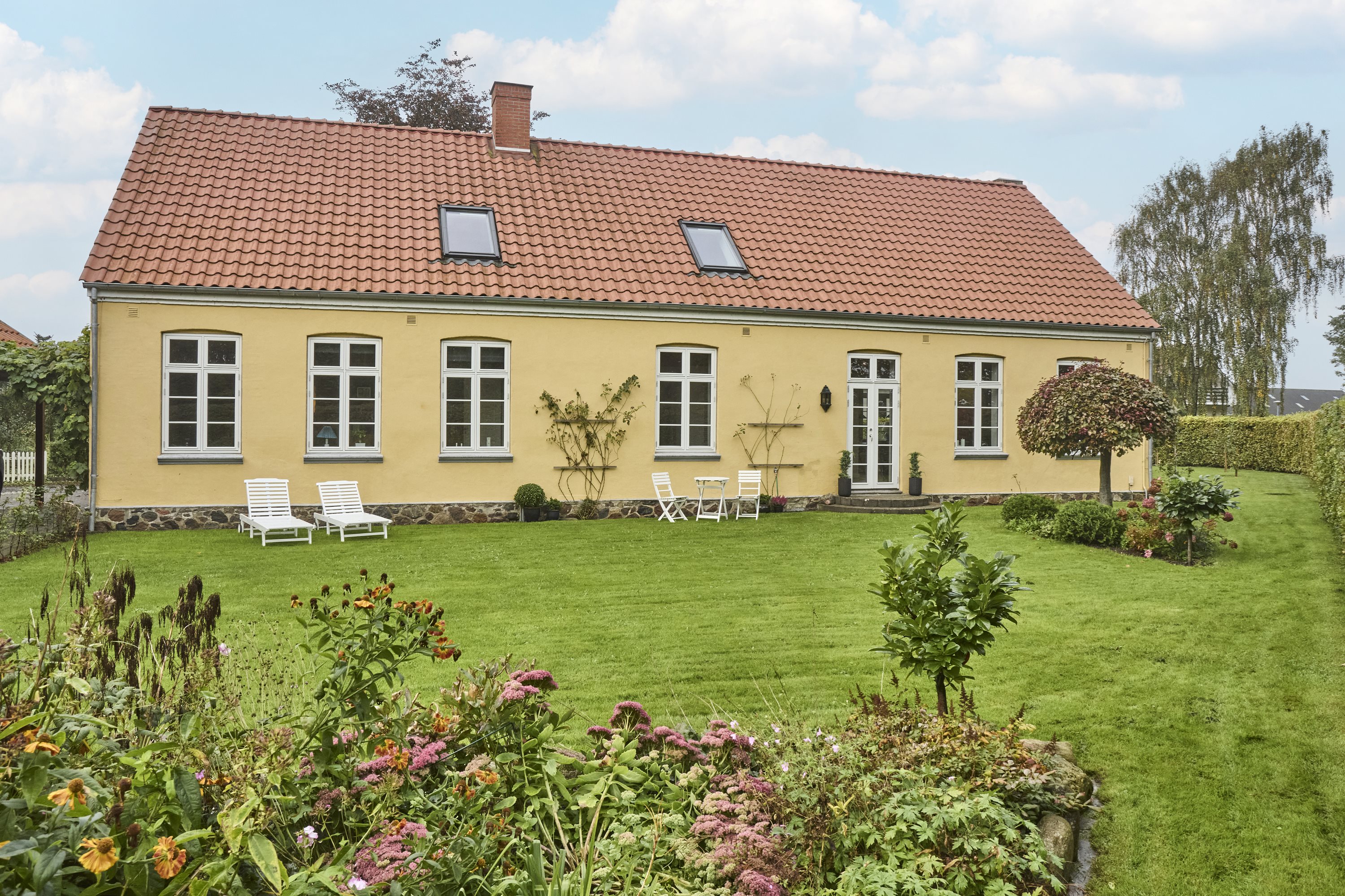 Langhuset står smukt på en solid kampestenssokkel, der harmonerer perfekt med den gule facade og det røde tegltag, som blev skiftet i 2019. Rundt om huset finder du en velanlagt have, og du fornemmer hurtigt roen og naturen der omfavner dig. Den skønne have indbyder til leg, afslapning og hygge, og det vil også være helt ideelt med en stor havefest, når familie og venner skal samles.