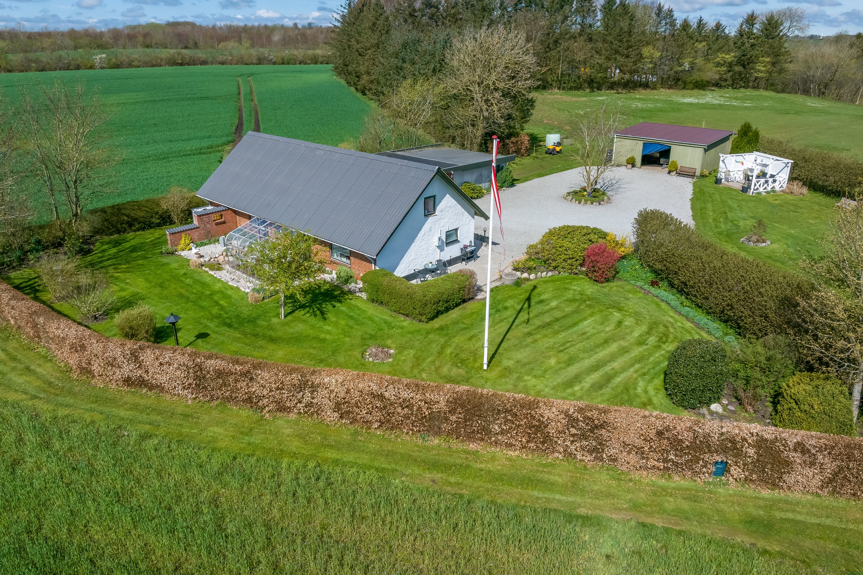 Haven mod syd byder på udover den dejlige udestue samt udsigten ud over markerne på en overskuelig have mest med græs, går man i modsat retning har man en stor dejlig gårdsplads, med et udhus i træ for enden af gårdspladsen - anvendeligt til maskiner, trailer mm. ved siden af har man en lille have terrasse hvor man sagtens kan nyde en kop varm kaffe eller et glas koldt på en dejlig sommerdag.