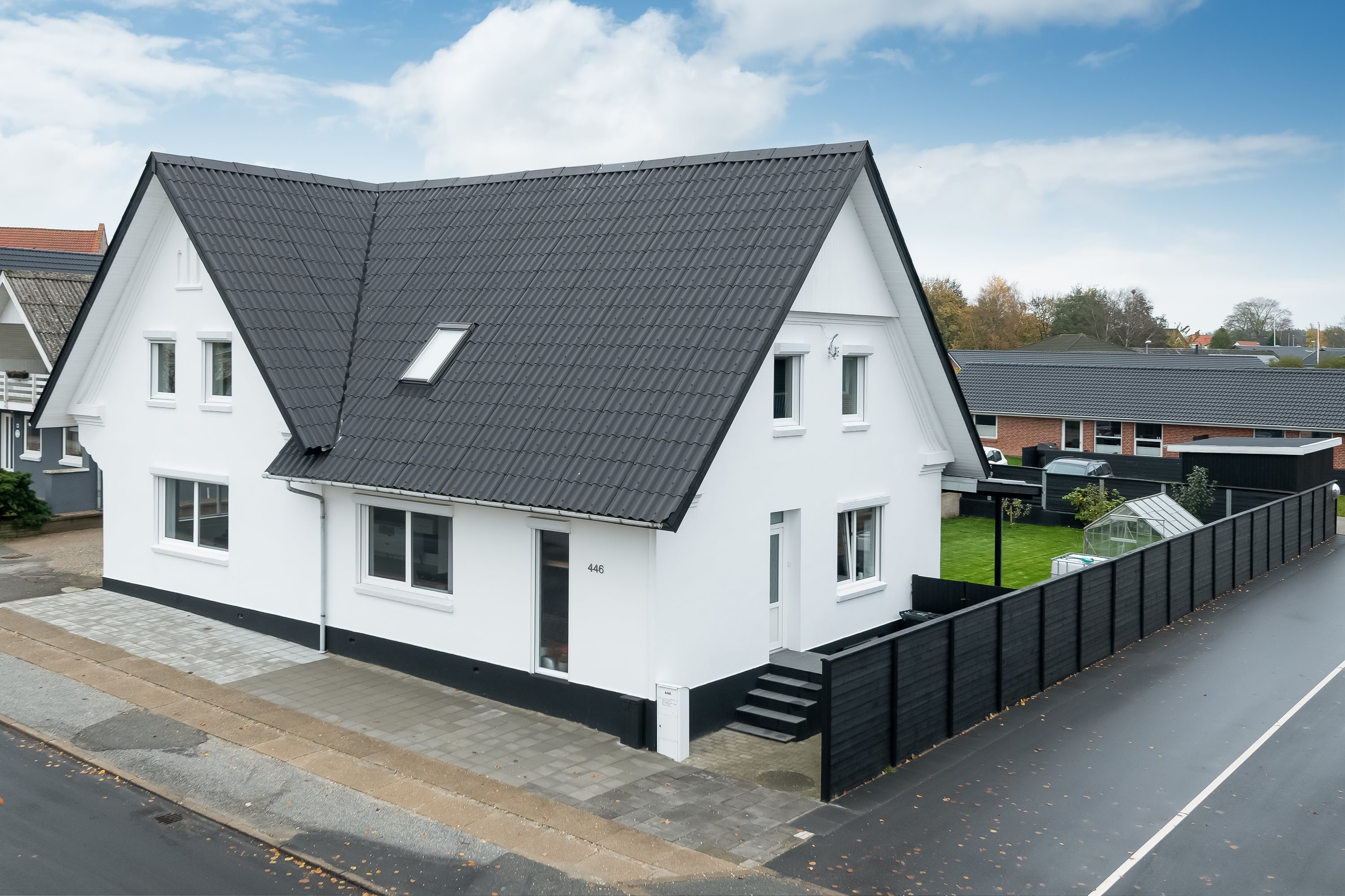 Du får et samlet boligareal på 168 m² i 3 plan, hertil kommer skøn overdækket terrasse og fin lukket have, der har en størrelse, der gør at den er let at overskue. Carport med plads til 2 biler samt garage med ledhejseport. Haven, der indhegnet med sort plankeværk, har mindre køkkenhave, område med frugttræer, dejligt drivhus og fra terrassen direkte udgang til græsplænen.