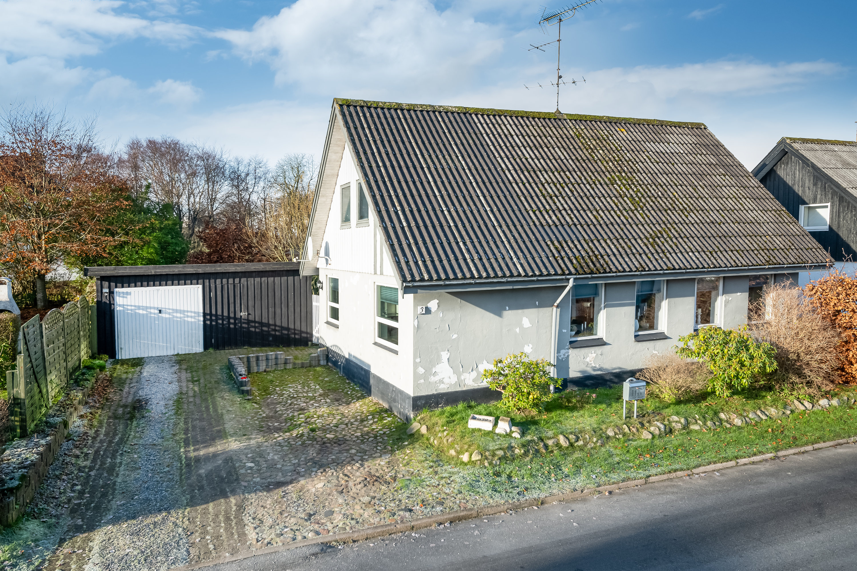 For enden af indkørsel finder du garage med plads til både bil og ekstra dæk mv.
