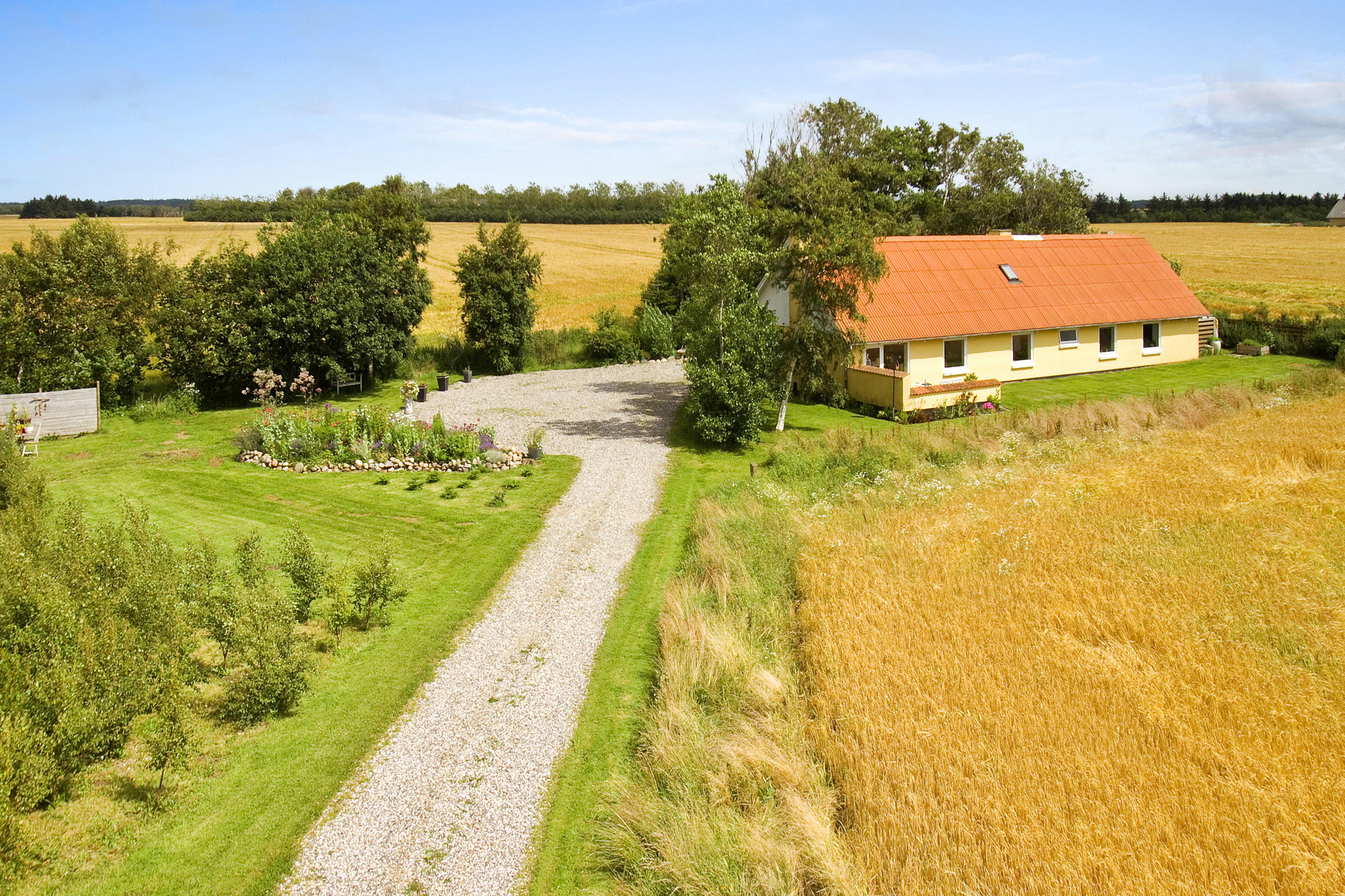 Grunden og området omkring ejendommen er rolige og naturskønne. Her bor du omgivet af åbne marker, grønne vidder og enkelte større landejendomme, hvilket giver en dejlig følelse af luft og frihed. På den ene side af huset finder du et hyggeligt gårdhavemiljø med overdækket terrasse – perfekt til afslapning og hyggelige sommeraftener – mens der på den anden side er en dejlig have med græsplæne, der indbyder til leg og udeliv.
