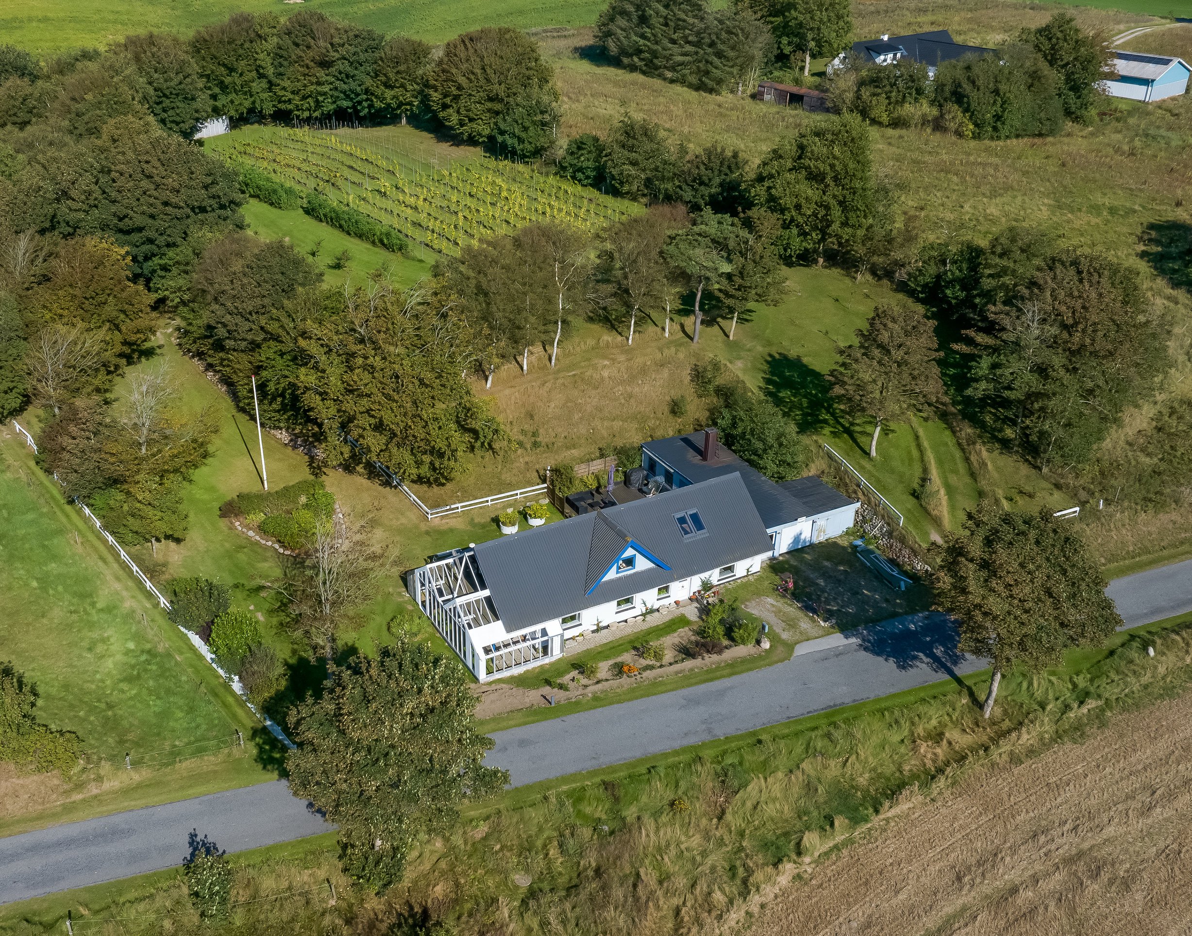 Der er plantet en del økologiske frugttræer, bærbuske samt en del vinstokke både rød-, rose-, hvid-, og mousserende vin. Så har man en lille "vinbonde" i sig er forarbejdet lavet, man har også mulighed for at sælge stokkene og lave lige præcis det man ønsker, om det er til en bette hest eller to, er der også plads til det.