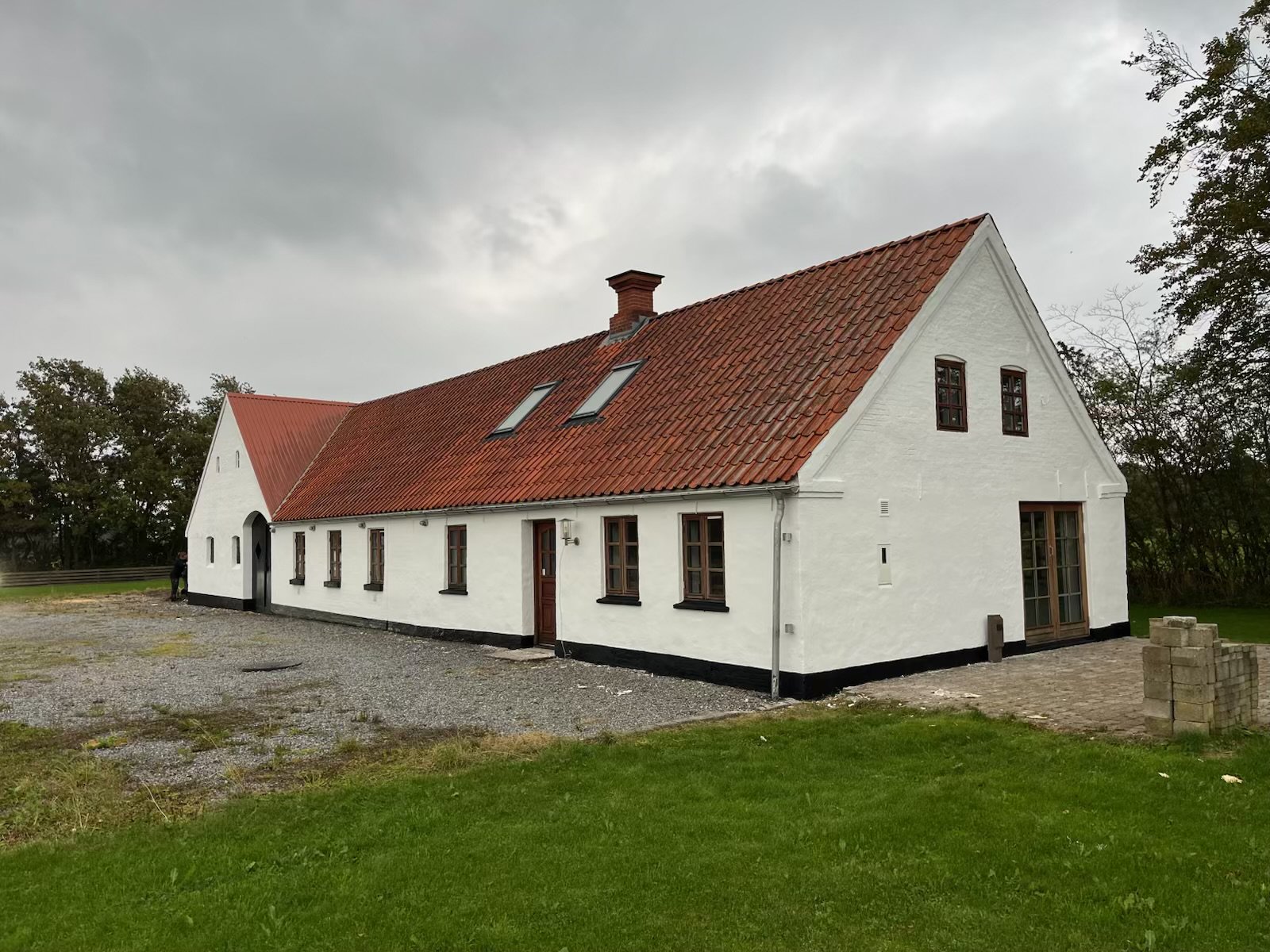 Hvidkalket hus med bondehus mahogni vinduer og tegltag på boligdelen.