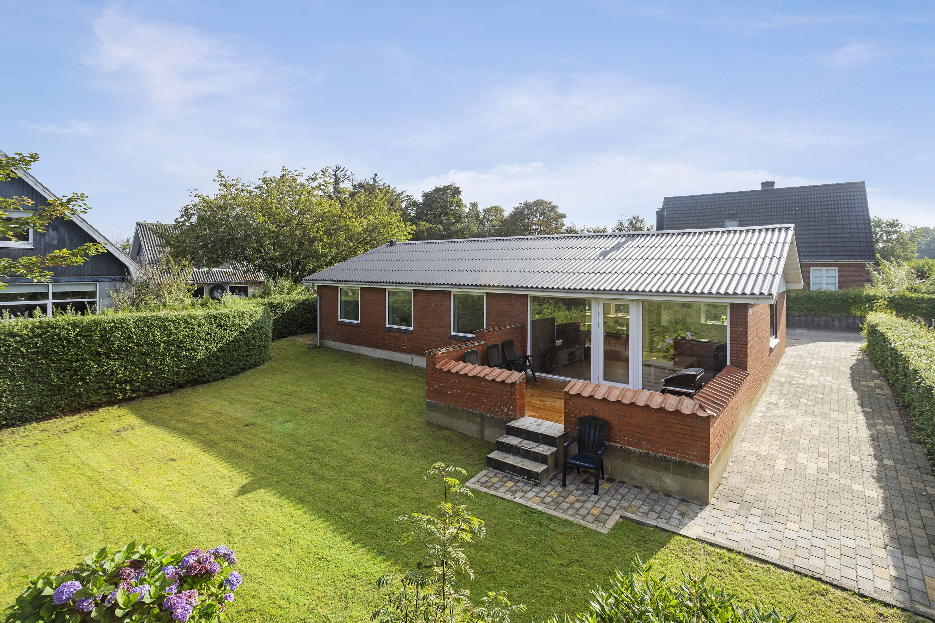 Beliggenheden på lukket villavej gør at børnene kan lege sikkert og der er en stor græsplæne med til huset, så boldspil både hjemme og på stadion vil være en mulighed. På den ekstra grund er der mindre skur til plæneklipper / brænde / cykler mv. og der er lavet en ekstra terrasse på grunden.