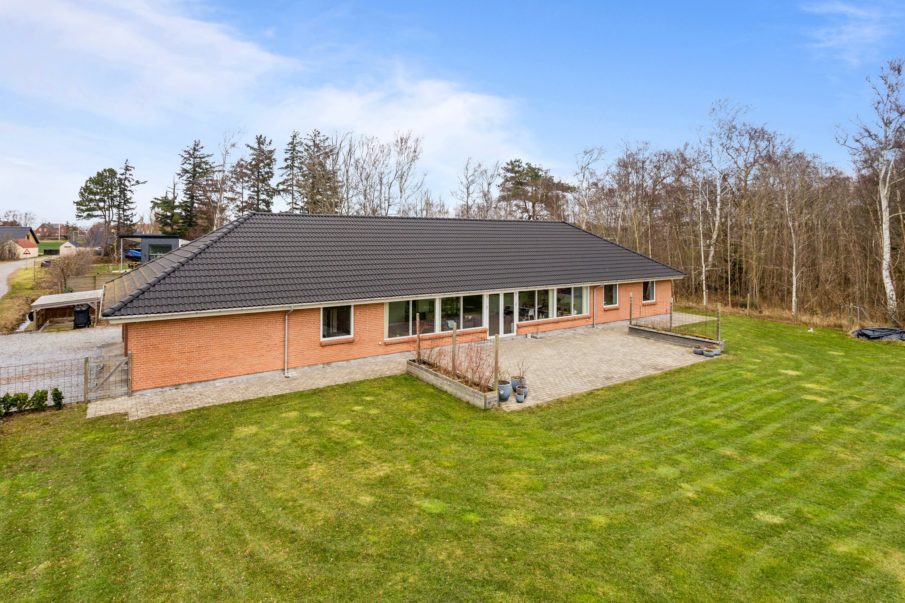 Huset er et flot 1 plans rødstensvilla opført i 2018. Huset rummer hele 252 m2 fordelt på 209 bolig m2 samt 43 m2 indbygget dobbelt carport. Huset indeholder entre, pænt bryggers med god plads, stor lys stue med store vinduespartier og med sofahjørne, god spiseplads og udgang til skøn sydvendt terrasse og stor græsplæne. Der er halvmur fra stuen ud til pænt køkken med spots, gode hårde hvidevarer og masser af arbejdsplads samt indgang til viktualierum. Huset rummer en forældreafdeling med stort soveværelse og eget badeværelse med bruseniche og forberedt til spabad/badekar. Hertil kommer en god børneafdeling med 4 gode værelser samt badeværelse med bruseniche.