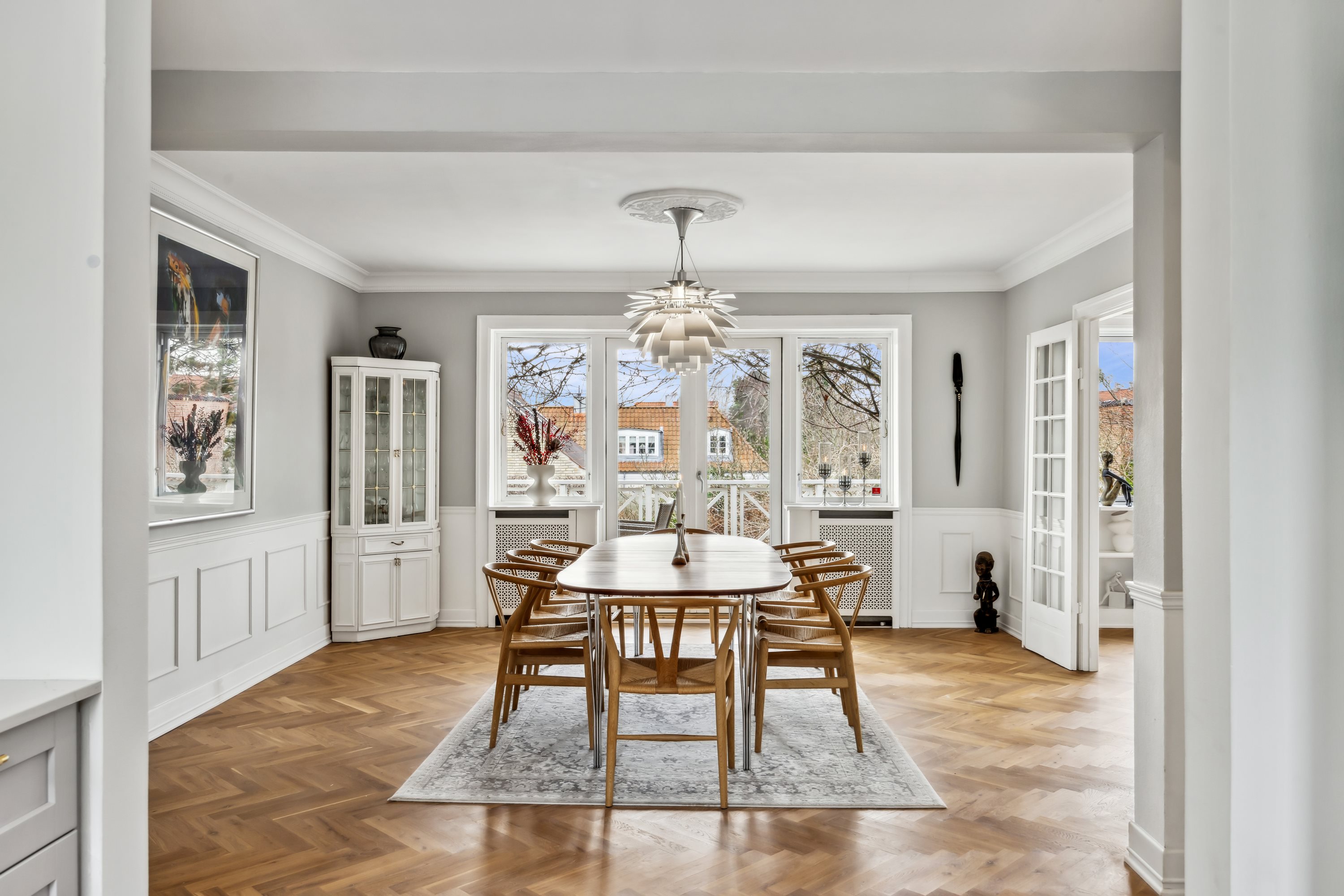 Fra terrassen kan I træde direkte ind i hjemmets hjerte: alrummet, der smelter sammen med stuen og det flotte køkken. En, to, tre værelser fordeles rundt, og hele vejen igennem løber de smukkeste gulve i sildebensmønster. Høje paneler, stuk mellem væg og loft, rosetter, flotte radiatorskjulere og franske døre – ja, de smukke detaljer er mange, og den herskabelige stil understreges af, at stuen og alrummet ligger en suite. Og lyset? Det strømmer ind, for vinduespartierne kommer i op til fire fag, ligesom altandørene inviterer have, lys og luft ind – I kan stille dørene på vidt gab, og på lune dage bliver det en fornøjelse at lade ude og inde smelte sammen.
