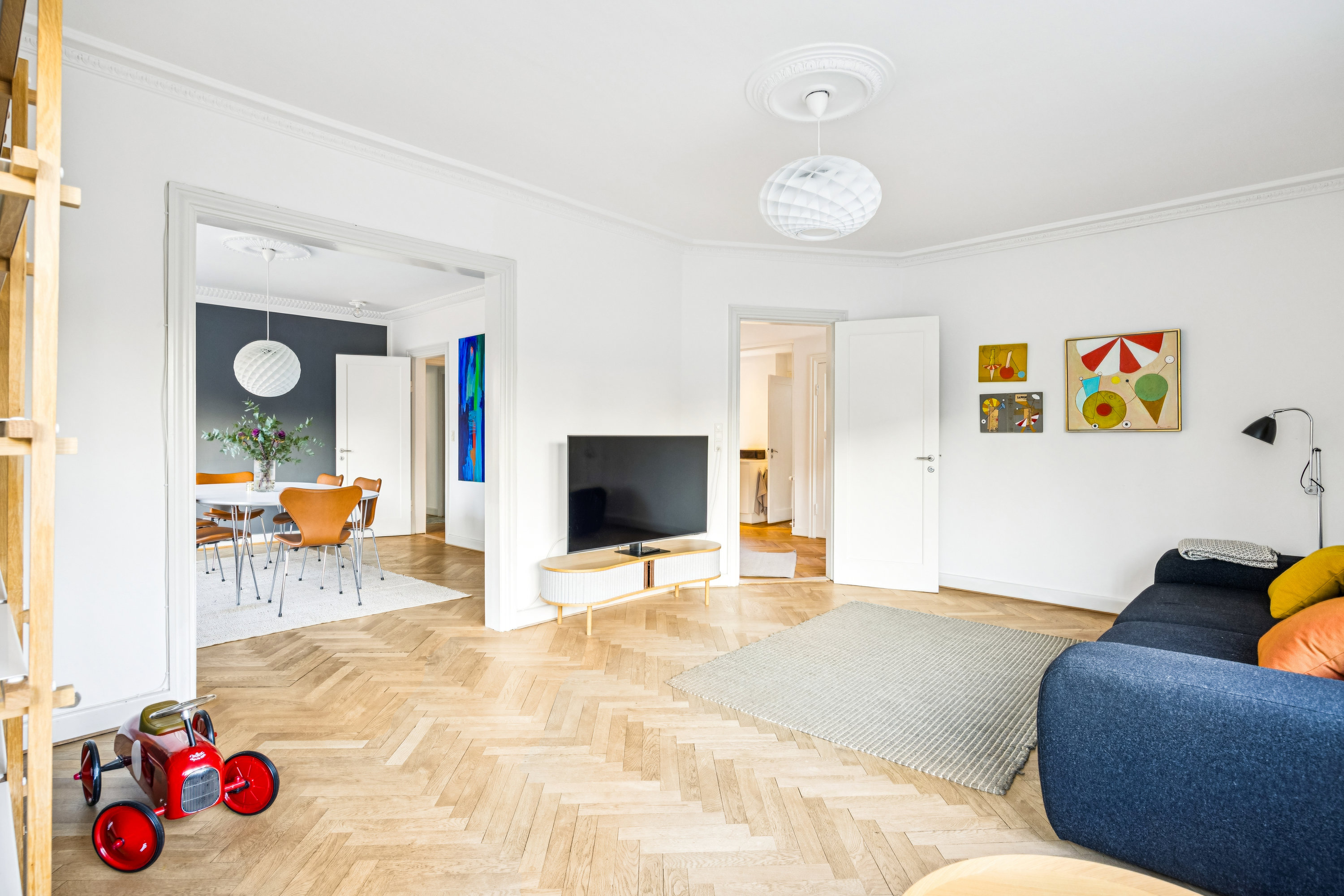 Stueetagen byder på et lyst og stilrent køkken udført i hvide elementer med gode arbejdsflader og rigelig opbevaringsplads. Køkkenet ligger i naturlig forbindelse med boligens opholdsrum og indbyder til både daglig brug og sociale sammenkomster. De to smukke sammenhængende stuer fremstår lyse og indbydende med et behageligt lysindfald fra store vinduespartier, som skaber en let og luftig atmosfære. Her er god plads til både spiseafdeling og sofaarrangement, og rummene egner sig fortrinligt til såvel hverdagsliv som mere repræsentative sammenhænge.